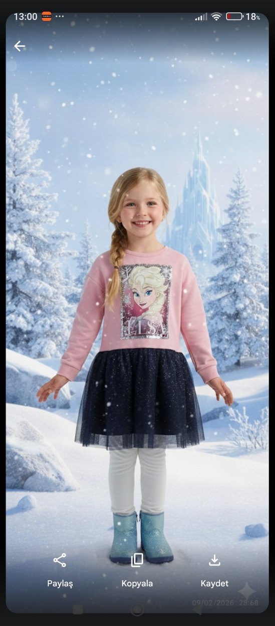Pembe renkli, uzun kollu, yuvarlak yakalı ve üst kısmı kışlık kumaş kız elbisesi. Önünde ışıltılı Elsa baskısı ve koyu lacivert renk tül etek detayı bulunur. Rahat ve şık bir seçenek. ❄️ bi sorunu yok 6-7 -8 yaşa uygun