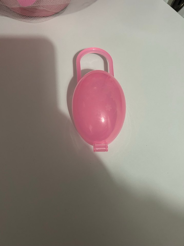 Taşınabilir kulplu pembe emzik kutusu, emziklerin hijyenik saklanması için uygundur.