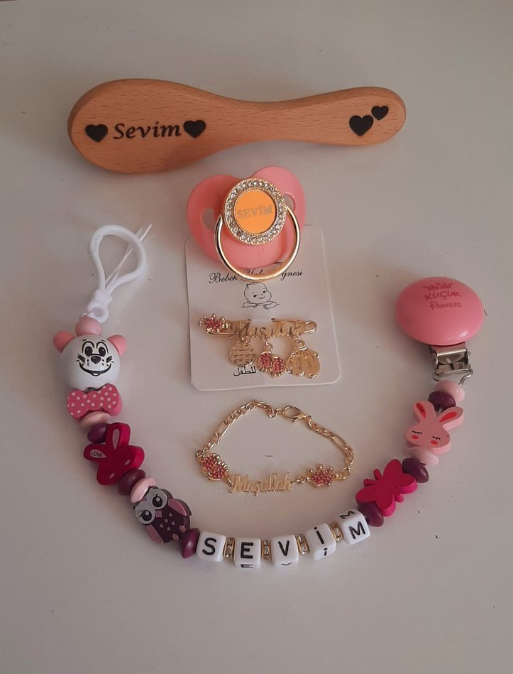 Açık pembe emzik, "Sevim" yazılı ahşap fırça ve uyumlu aksesuarlar içeren set. Hayvan figürlü boncuklar ve bileklik bulunur.