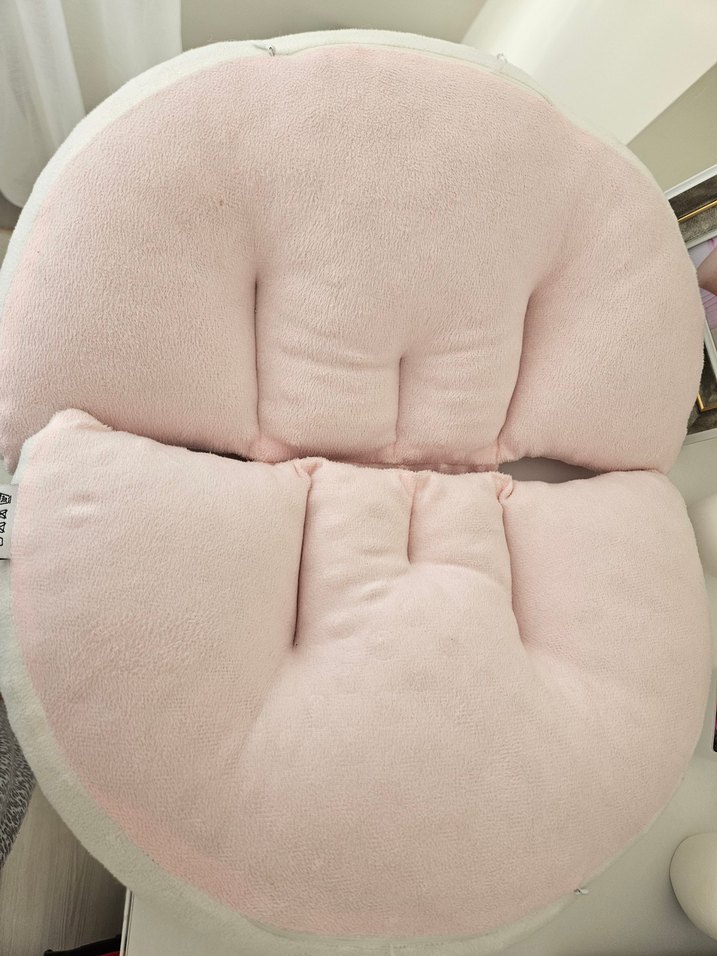 Pastel pembe, desen içermeyen ve yumuşak dokulu emzirme ve hamile yastığıdır.