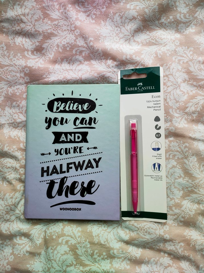 Pastel pembe Faber-Castell mekanik kurşun kalem ve üzerinde 'Believe you can and you're halfway there' yazılı motivasyon defteri seti. ✏️