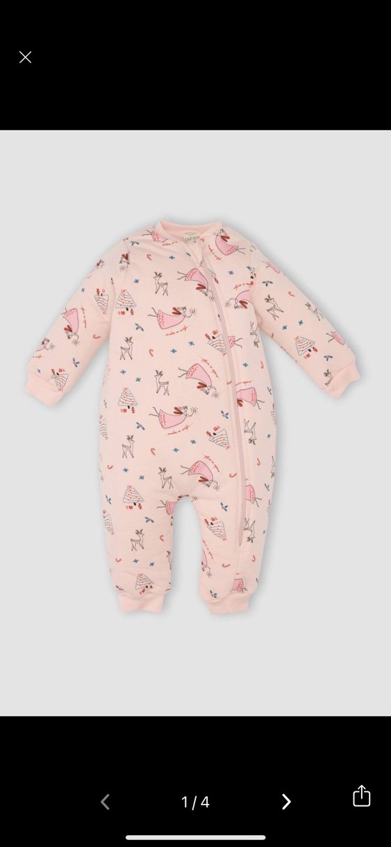 Pastel pembe renkte, fermuarlı ve yuvarlak yakalı bebek kış tulumu. Yumuşak kumaş ve ince baskı detayları bulunur. 2,5 tog
