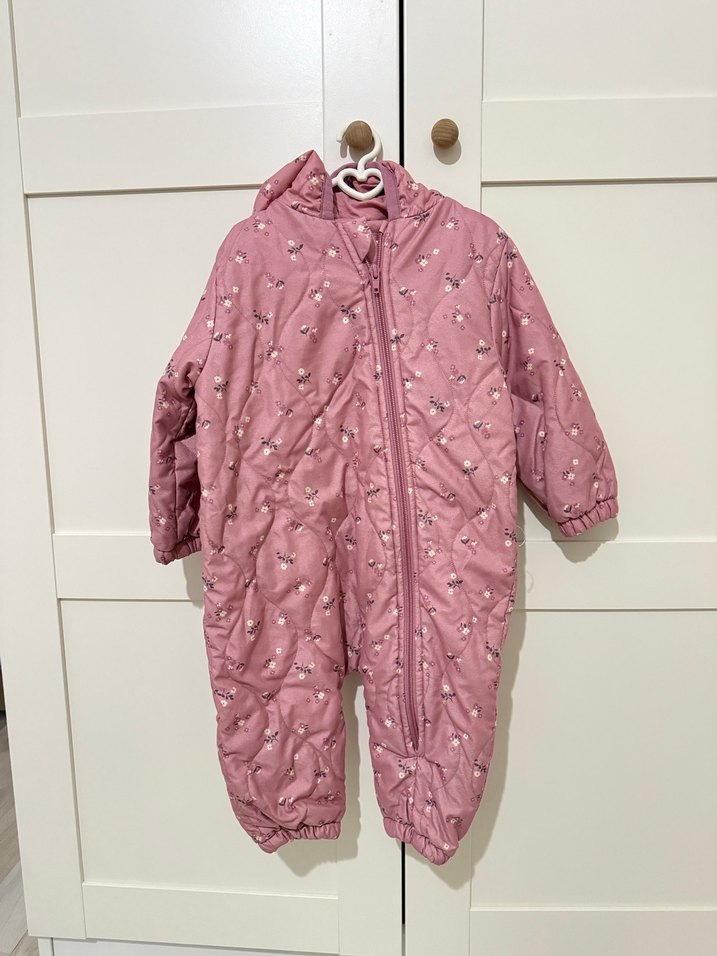 Pastel pembe renkte, fermuarlı ve yakası notched lapel olan bebek kız tulumu, soğuk havalar için yumuşak ve sıcak kumaştan yapılmıştır. ❄️ #tulum #bebektulumu