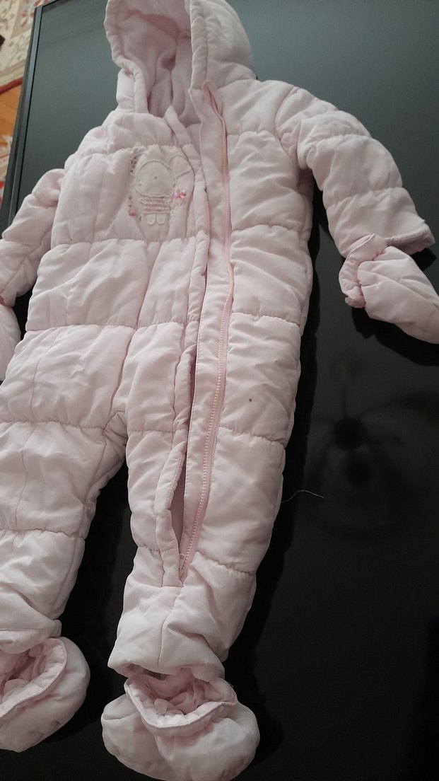 Pastel pembe renkte, fermuarlı ve yakası kesimli bebek kız tulumu. Yumuşak ve sıcak tutan kumaşa sahiptir.