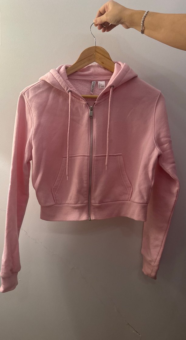 Fermuarlı, uzun kollu ve kapüşonlu pembe crop sweatshirt. Yumuşak dokulu kumaştan, pastel tonlarda ve bisiklet yaka detaylıdır. Günlük sokak stiline uygundur. Yıkanınca çıkabilme ihtimali olan bir lekesi var son görsele eklediğim