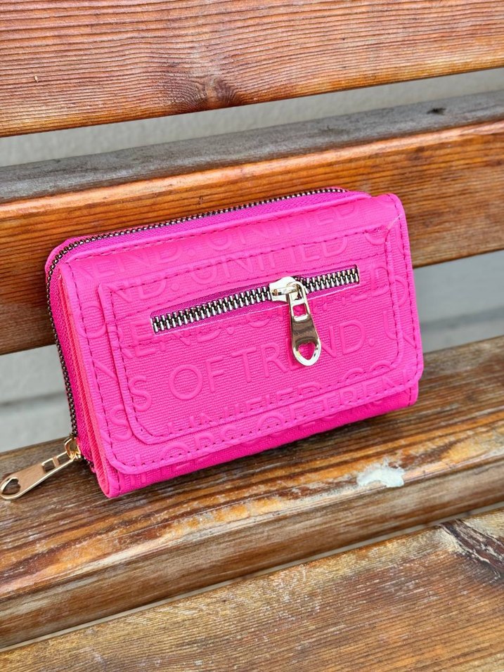 Renkli pembe deri kadın cüzdan, fermuarlı tasarıma ve 'OFT' kabartmalı desene sahiptir. Günlük kullanıma uygun rahat bohem tarzı sunar.