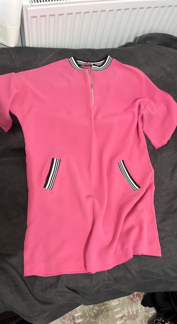 Pembe, kısa kollu, fermuarlı hamile tişörtü. Bol kesim, yuvarlak yakalı ve çizgili cep detaylarına sahip, yumuşak ve sıcak kumaştan.
