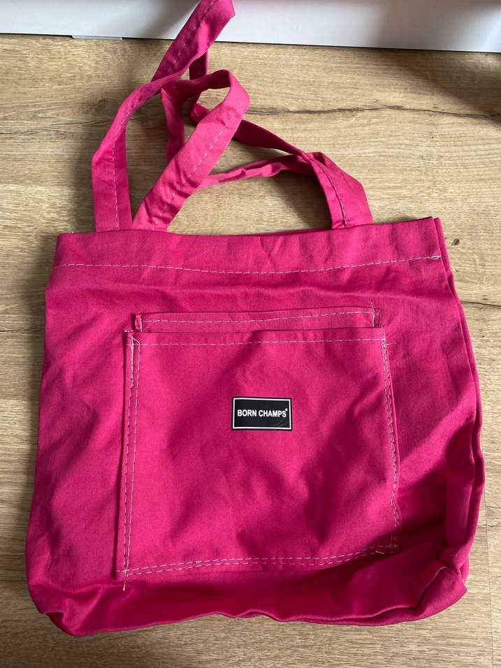 Pembe renkli, fermuarlı cepli kadın çantası, parlak sentetik kumaştan yapılmıştır. Minimalist ve desensiz tasarıma sahiptir, üzerinde 'BORN CHAMPS' logosu bulunur.