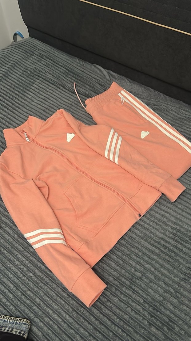 Yumuşak kumaştan, fermuarlı ve yüksek yakalı pembe kadın eşofman takımı. Uzun kollu, dar kesim ve beyaz çizgili, sokak stiline uygun rahat bir model. ♀️