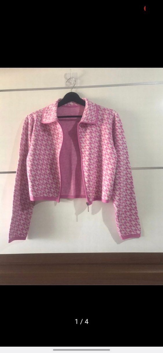 Uzun kollu, yaka detaylı ve fermuarlı pembe bağlama desenli kadın hırka. Yumuşak ve sıcak kumaştan, midi boy ve dar kesimdir. S-M beden uyumludur.