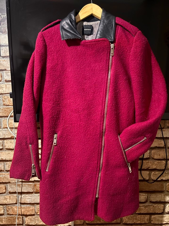 Fermuarlı cepleri ve kolları olan, uzun kollu, notched lapel yaka detaylı pembe renkli, yumuşak ve sıcak kumaştan yapılmış, rahat ve şık kadın kaban.
