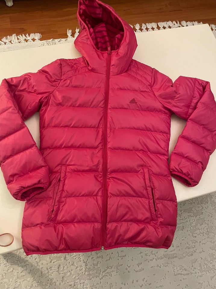 Fermuarlı cep detaylı, parlak pembe kadife dokulu, uzun kollu, yüksek yakalı, normal boyda, rahat kesim kadın kışlık mont.orjınaldır