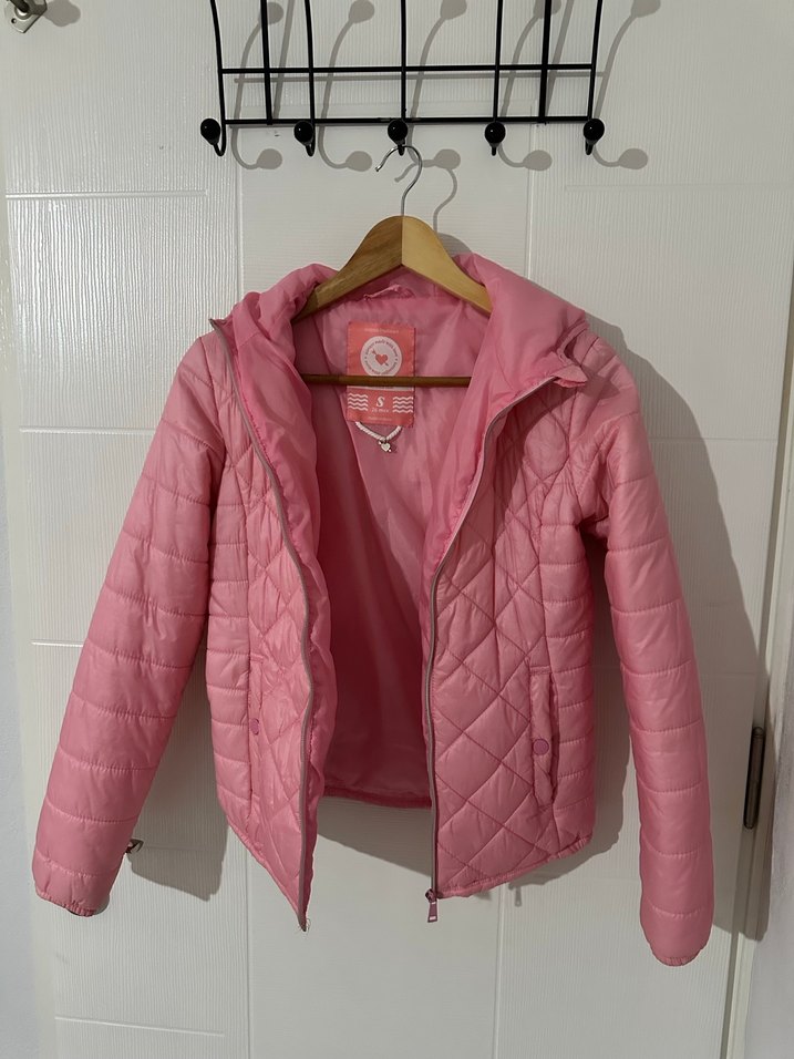 Pembe, fermuarlı, uzun kollu, notched lapel yaka detaylı, normal midi boyda, rahat ve sıcak kumaştan kadın mont.