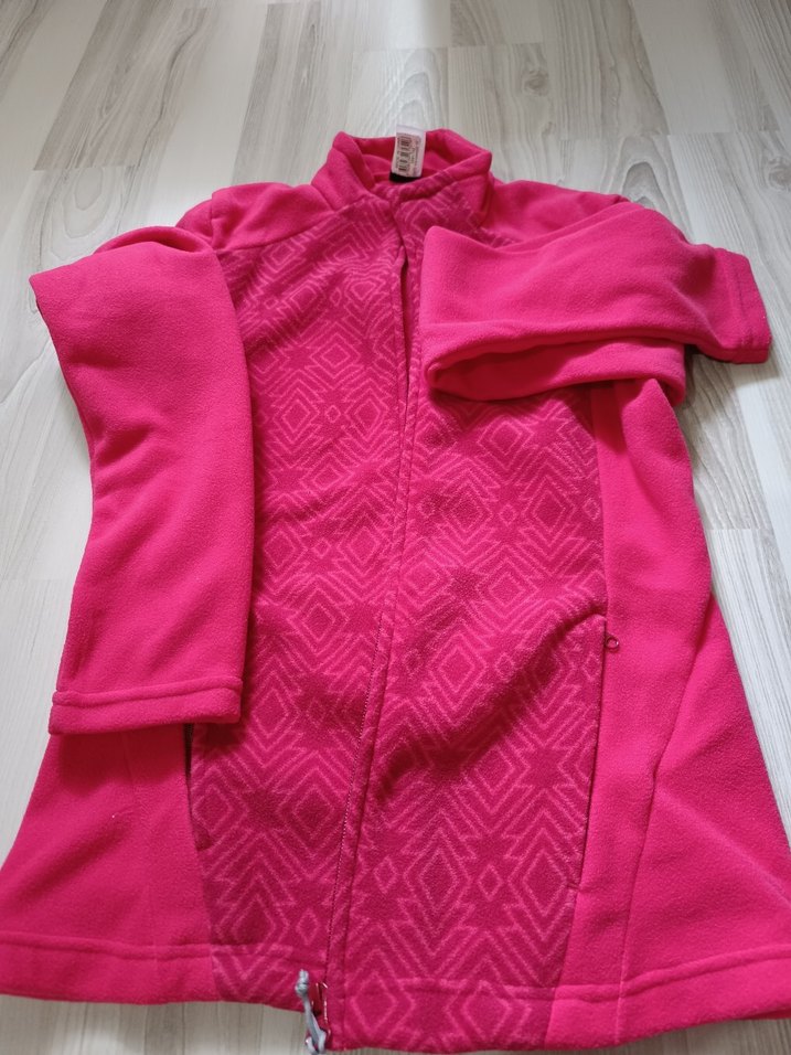 Pembe renkli, fermuarlı, yüksek yakalı ve uzun kollu kadın polar cekettir. Yumuşak ve sıcacık kış yürüyüşleri/kayak montu altına giymek için ideal bir ürün. Hiç giyilmedi denendi