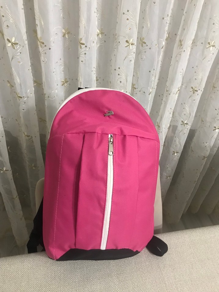 Renkli pembe, fermuarlı ön cepli, sentetik kumaştan kadın sırt çantası. Günlük kullanım için uygun, streetwear ve athleisure tarzına uyum sağlar.