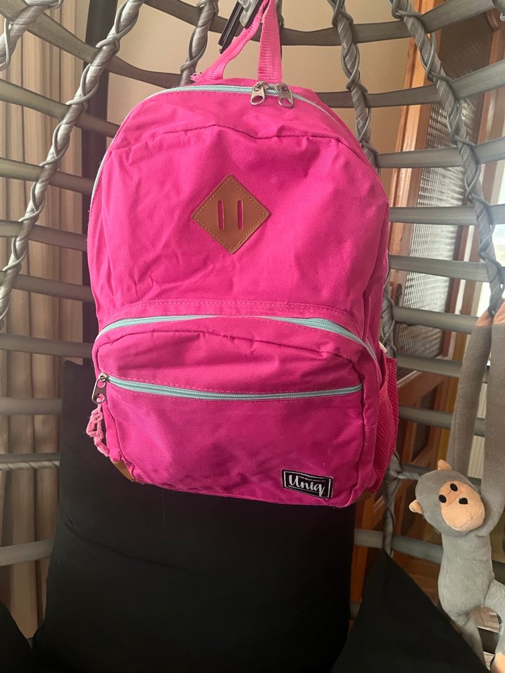 pembe renkte, fermuarlı cepleri olan dayanıklı sentetik kumaştan yapılmış kadın sırt çantası, günlük sokak tarzına uygundur.