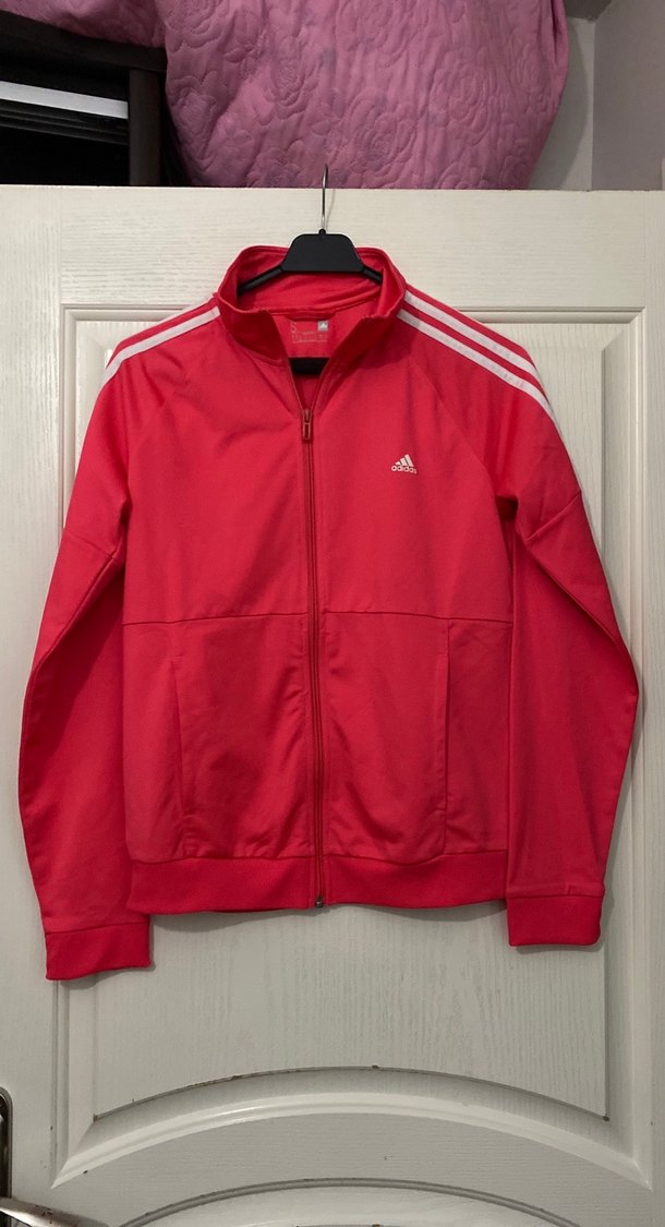 Uzun kollu, yüksek yakalı ve fermuarlı pembe açık renk kadın spor ceketi. Hafif sentetik kumaştan, omuzlarda beyaz şerit detaylı, sportif ve günlük kullanıma uygun. 46 cm boyu 60 cm