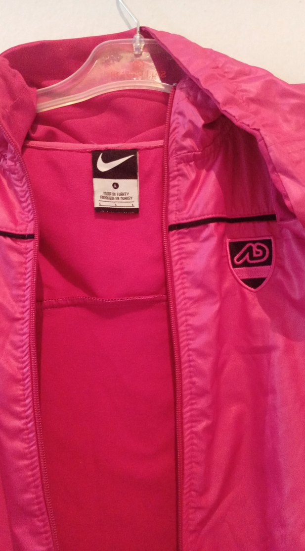 Fermuarlı, uzun kollu, normal boyda pembe parlak sentetik kumaştan kadın spor ceketi. Notlu yakalı ve baskılı desene sahip, sokak tarzına uygun şık bir parça.