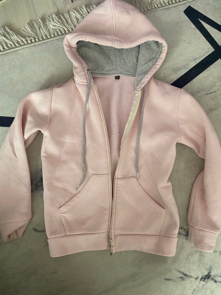 Pembe fermuarlı, kapüşonlu, uzun kollu ve bisiklet yaka kadın sweatshirt. Normal boyda, rahat kesim, günlük kullanım için uygun. Yumuşak ve sıcak kumaş içerir.