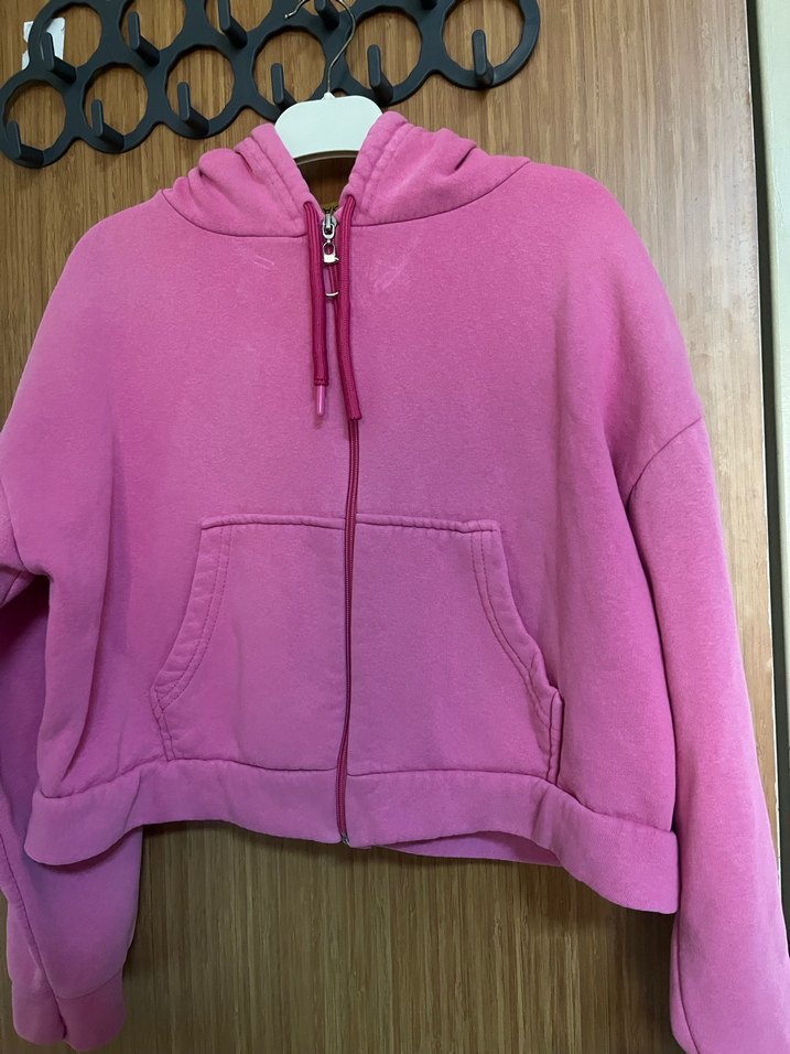 Yumuşak kumaştan yapılmış, fermuarlı ve kapüşonlu pembe kadın sweatshirtü. Yuvarlak yakalı, uzun kollu ve bol kesim, rahat sokak stili için uygun.