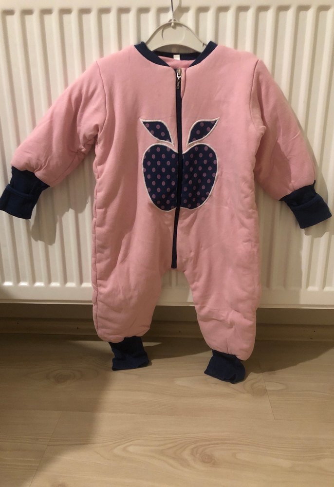 Pastel pembe, fermuarlı ve notched lapel yakalı kız bebek tulumu. Koyu mavi elma deseni ile yumuşak ve sıcak kumaş.