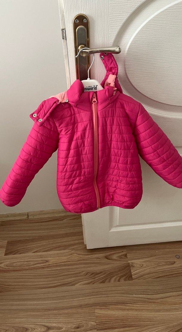 Fermuarlı, kesimli ve pembe renkte kız çocuk montu. Yumuşak kumaştan, modern sokak stiline uygun.