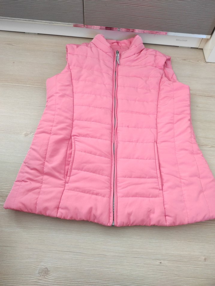 Pembe renkte, fermuarlı ve yüksek yakalı, kolsuz yelek. Yumuşak ve sıcak kumaştan, rahat sokak stili için uygun.
