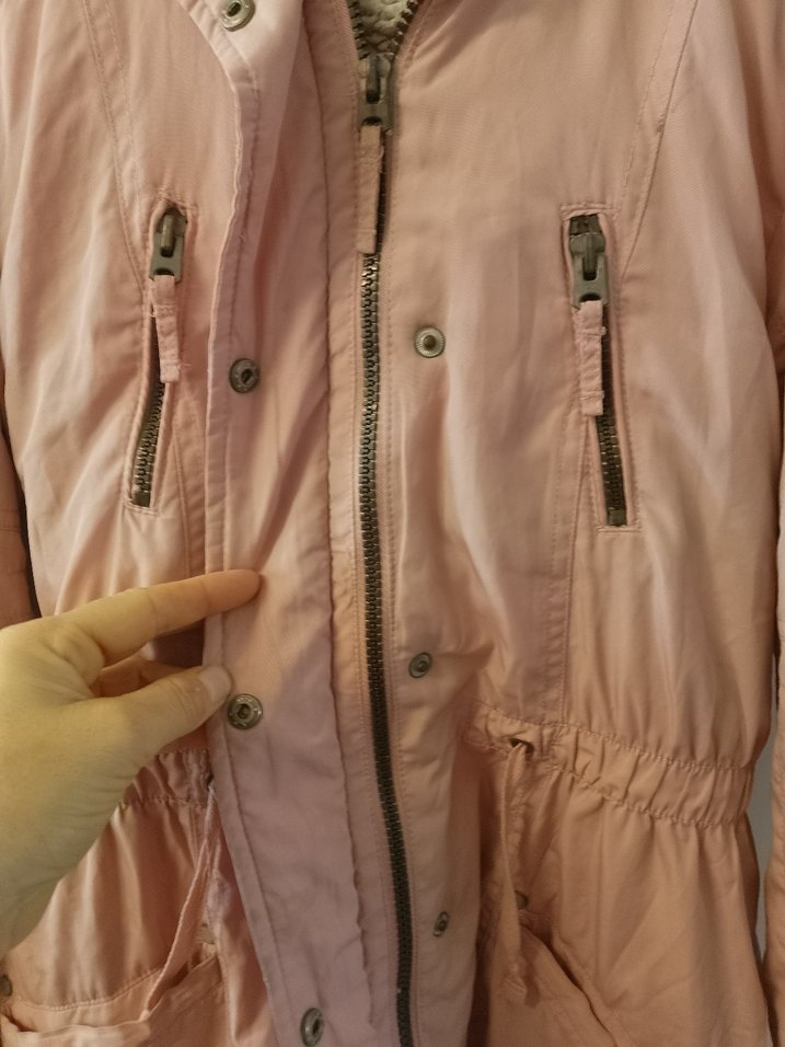 Pastel pembe renkli, fermuarlı cepleri ve kesik yakası olan, sentetik kumaştan yapılmış midi uzunlukta, dar kesim ceketi. Sokak stili için uygun.