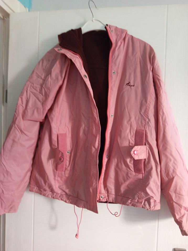 Pastel pembe renkli, fermuarlı ve çıtçıtlı uzun kollu kadın ceket. Midi boy, rahat kesim ve yumuşak, sıcak kumaştan üretilmiştir.