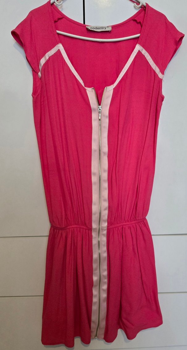 Parlak pembe renkte, V yakalı ve ön fermuarlı, kolsuz, vücuda oturan midi elbise. Pürüzsüz sentetik kumaştan, modern ve spor tarzı bir arada sunar.38 beden de rahat kullanilir.