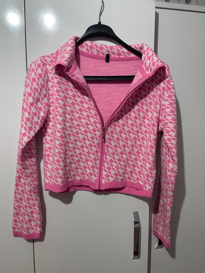 Dar kesim, uzun kollu, fermuarlı kadın ceketi. Pastel pembe kazayağı deseni ve yüksek yaka ile rahat ve şık bir sokak giyimi parçası.