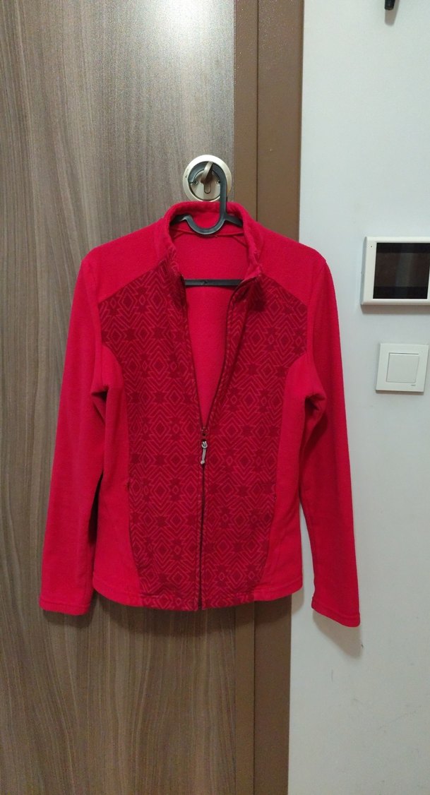 kırmızı gibi çıkmış ama rengi pembe Yüksek yakalı, uzun kollu, yumuşak ve sıcak kumaştan yapılmış, fermuarlı ve ince desenli kırmızı renkli kadın ceketi. Günlük ve sokak tarzına uygun.