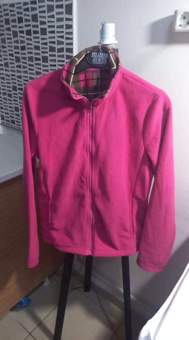 Pembe renkli, yüksek yakalı, fermuarlı ve uzun kollu kadın ceketi. Yumuşak ve sıcak kumaştan, normal boyda, günlük ve sokak stili için uygun.