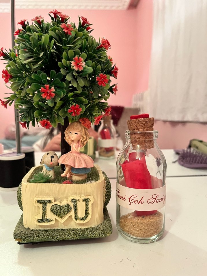 Pastel pembe renkte, kız figürlü çiçekli dekoratif ağaç ve içinde mesaj bulunan cam şişe. Tabanında 'I ♥ U' yazısı bulunur. Müzikli dönüyor sadece altında ki aparatı kayboldu yapmak isteyen yapabilir