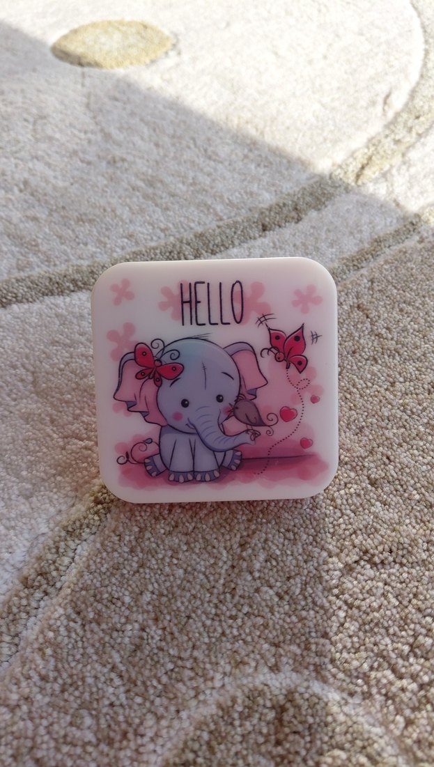 Pastel pembe renkli, fil ve kelebek desenli gece lambası. üzerinde "HELLO" yazısı bulunur.
