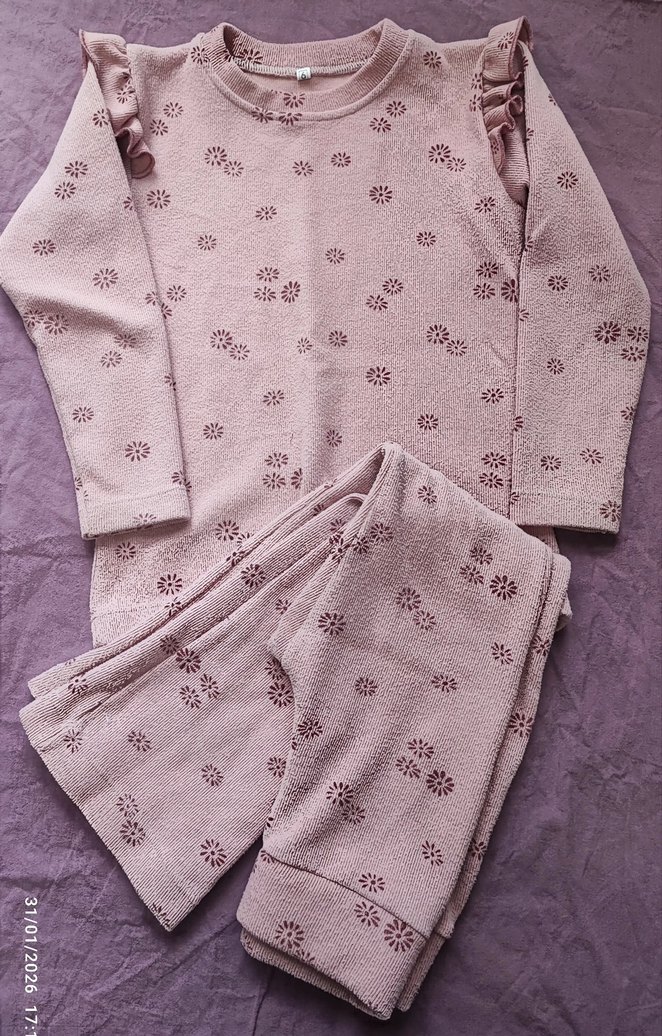 Pastel pembe renkte, uzun kollu ve dantel detaylı bebek kız kıyafet takımı. Yumuşak kumaş ve hafif çiçek desenleri içerir. Tarih: 1/01/20
