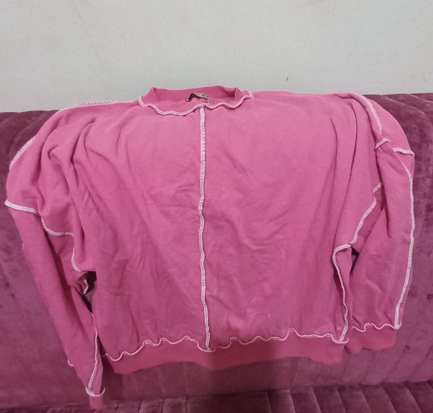 Pembe renkli kadın sweatshirt, yuvarlak yaka ve uzun kollu. Dikişlerde fırfır detayları bulunur. Yumuşak keten kumaştan, bol kesim ve normal boyda, rahat günlük kullanım için uygun. ufak tefek lekeleri var almak isteyen sorabilir