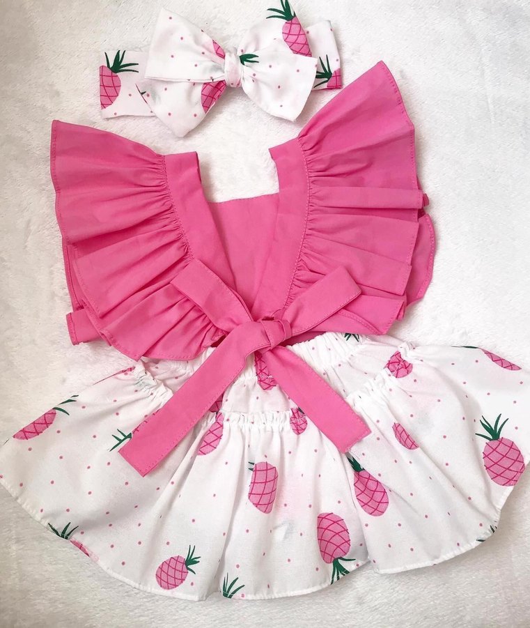 Renkli pembe fırfırlı ve ananas desenli kız bebek tulumu. Fiyonklu uyumlu saç bandı da içerir. Sıfırdır. 0-6 ay uyumludur