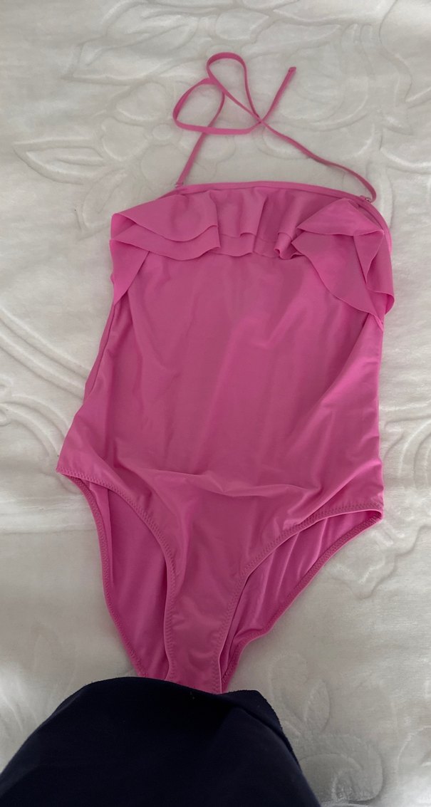 Pembe, askılı ve fırfırlı detaylı, normal boyda ve vücuda oturan kadın mayo. Plaj için uygun, pastel tonlarda sade bir tasarım.