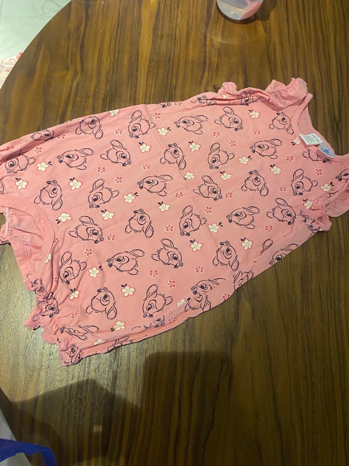 Pembe renkli, pastel baskılı bebek kız tulumu, hayvan yüzleri ve küçük çiçek desenleri içerir. Kollarında ve bacaklarında fırfır detayları bulunur.