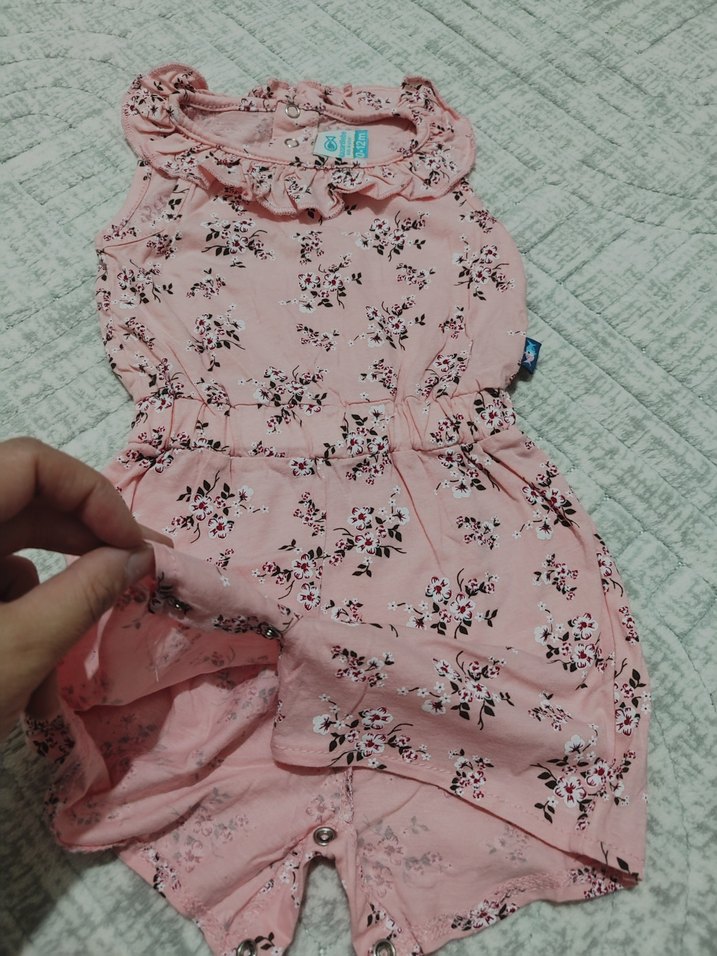 Pembe pastel tonlarda, çiçek baskılı ve yakasında fırfır detaylı yumuşak kumaştan kız bebek tulumu.