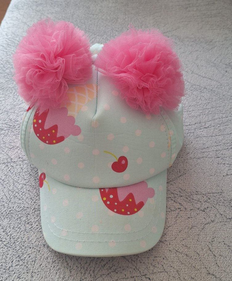 Pembe pastel renkli, baskılı desenlere sahip şapkanın üstünde iki büyük fırfırlı ponpon bulunur, sokak stiline uygun bir tasarım. Yurt dışından alındı