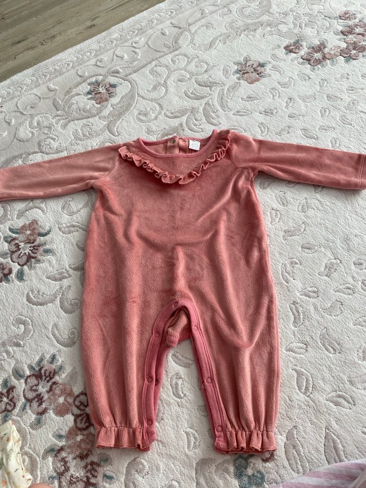 Yumuşak pastel pembe renkte, göğüs kısmında fırfır detaylı, uzun kollu bebek kız tulumu. Paçalarda lastikli ve bacak kısmında çıtçıtlıdır. Kadifedir