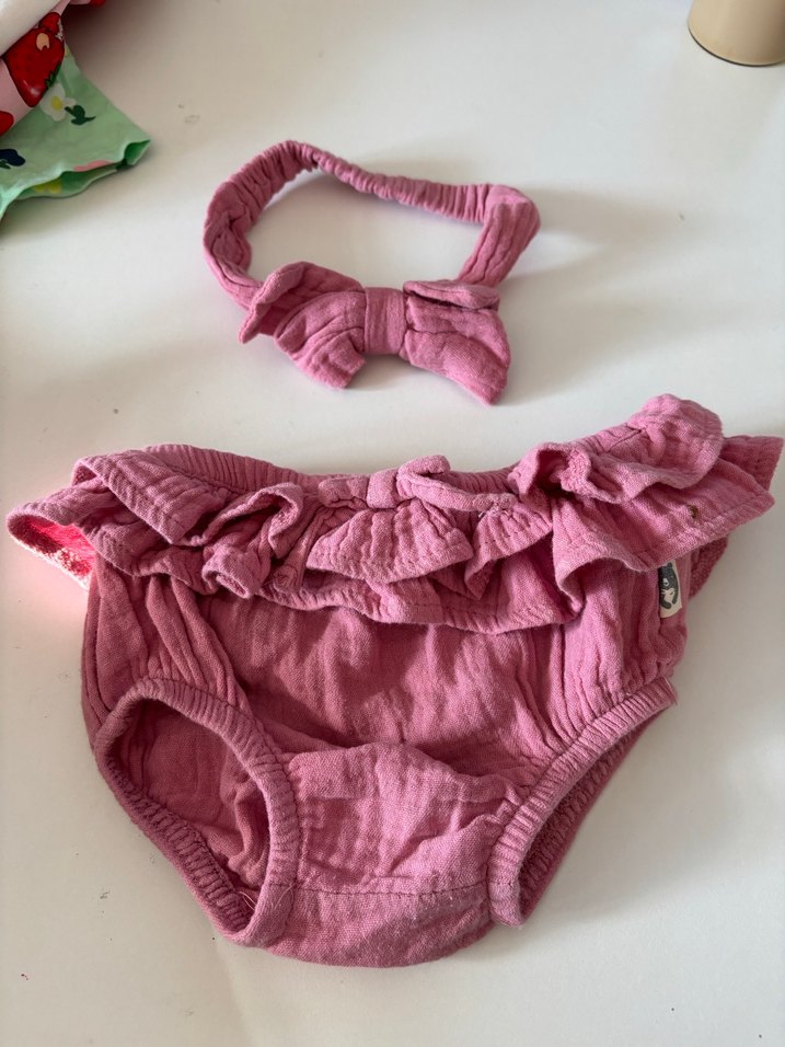 Pastel pembe renkte, askılı ve fırfırlı detaylara sahip bebek kız takımı. Fiyonk detaylı saç bandı ile tamamlanmıştır.