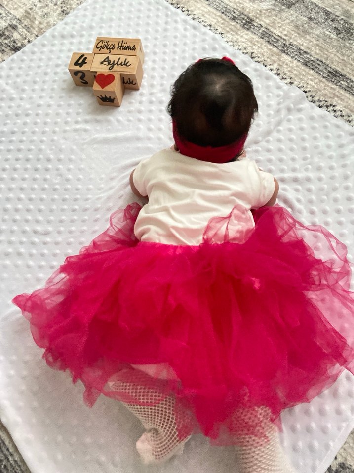 Yumuşak beyaz üst kısmı ve renkli pembe fırfırlı eteğiyle bebek hastane kıyafeti.