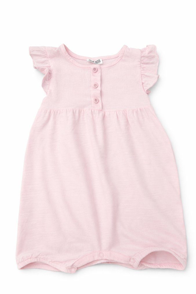 Yumuşak pembe renkli, fırfırlı kollu, önde düğmeli ve alt kısmında çıtçıtlı bebek tulumu.