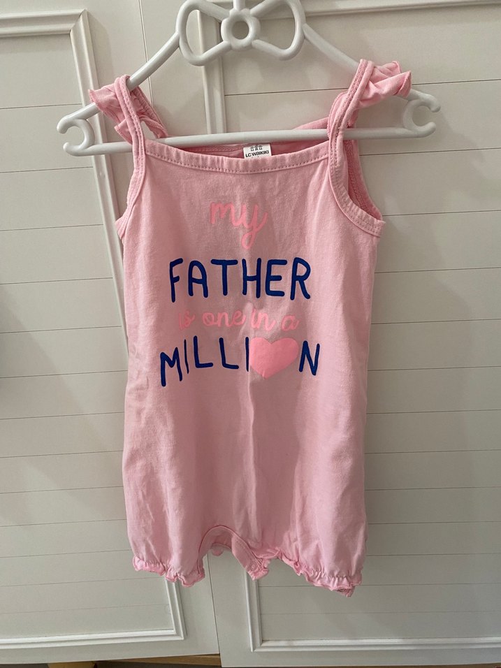 Pastel pembe renkli, baskılı ve fırfırlı askı detaylı bebek kız tulumu. Yumuşak kumaşıyla konfor sağlar.
