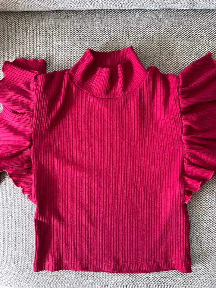 pembe, fitted kesim bluz. Yüksek yakalı ve uzun kollu, fırfırlı detaylara sahip. Yumuşak sentetik kumaştan yapılmıştır.