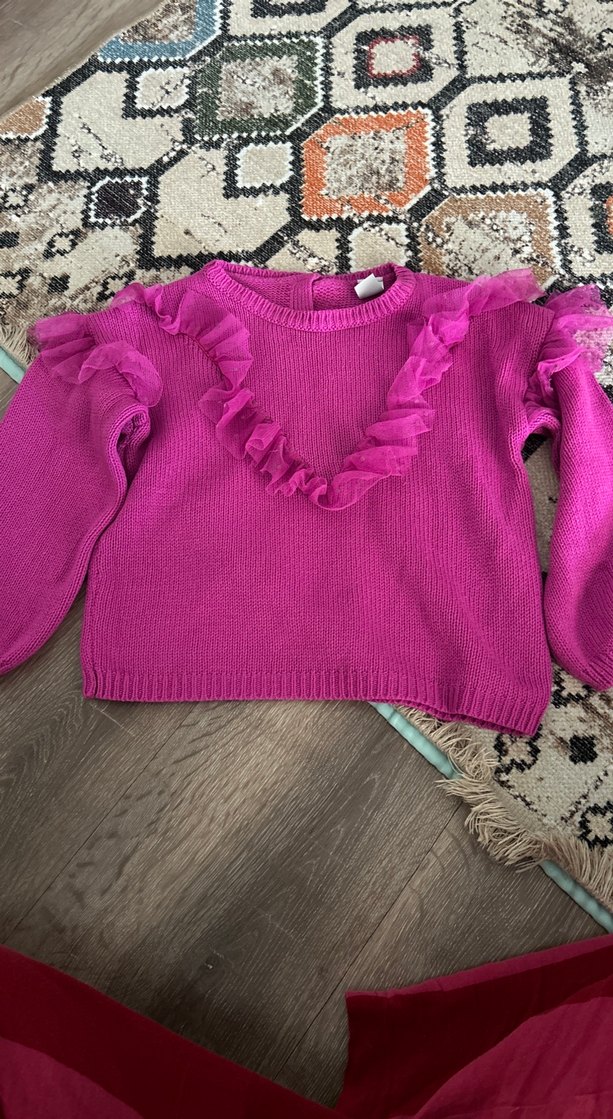 Pembe renkli, uzun kollu, yuvarlak yakalı, fırfır detaylı örme kazak. Rahat kesimi ve bohem tarzıyla dikkat çeker.