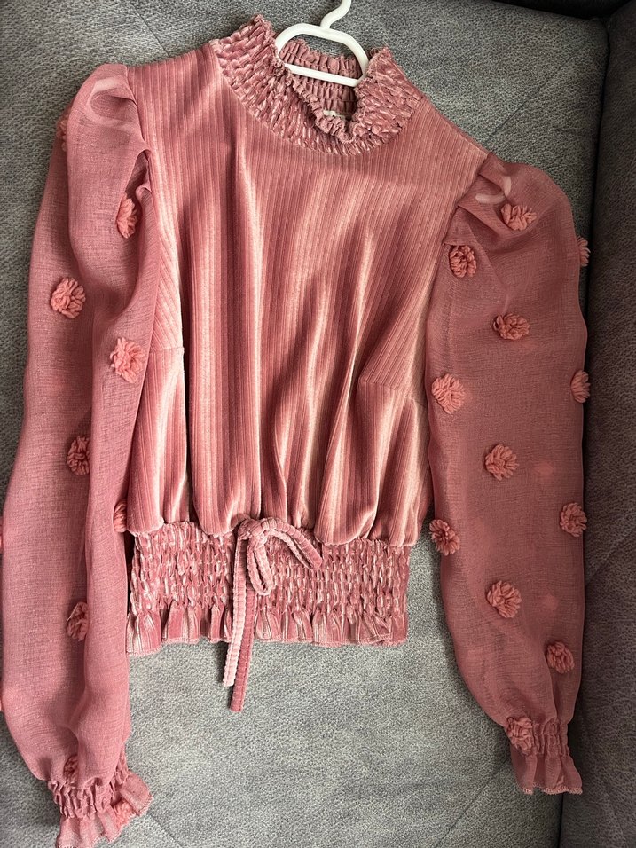 Pembe triko kumaştan, uzun kollu, fırfırlı detaylı, yüksek yakalı ve bol kesim bağcıklı bel kısmıyla bohem tarzda günlük kullanıma uygun bluz.